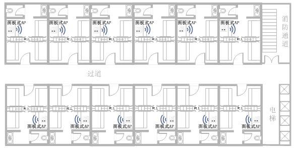 宿舍接入環(huán)境密集、墻壁阻隔較多,對無線信號的衰減相對較大,面板式AP推薦每個房間部署一臺。如下圖所示: