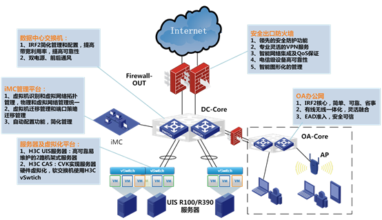 3、 辦公網(wǎng)一般采用園區(qū)網(wǎng)交換機,部署IRF2虛擬化技術提高可靠性,也便于網(wǎng)絡管理,并可選部署無線方案實現(xiàn)移動辦公和終端接入。