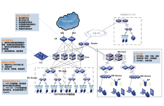 3、 辦公網(wǎng)采用高性能園區(qū)網(wǎng)交換機(jī),配置無(wú)線控制器和Firewall等安全插卡,同時(shí)部署IRF2虛擬化技術(shù)提高可靠性,也便于網(wǎng)絡(luò)管理,部署無(wú)線方案實(shí)現(xiàn)移動(dòng)辦公和終端接入。對(duì)于復(fù)雜多變的各種辦公終端,部署EAD方案實(shí)現(xiàn)安全準(zhǔn)入。