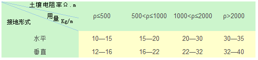 降阻劑的經(jīng)濟用量應視不同的土壤而定,在接地體上的敷設厚度應在5—15CM之間,為方便計算,推薦用量如下表: