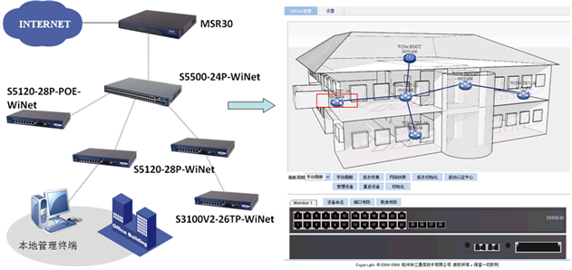 在企業(yè)或園區(qū)的網(wǎng)絡(luò)建設(shè)過程中,選用S5500-WiNet作千兆核心,接入層選用S5120-WiNet或S3100V2-WiNet實(shí)現(xiàn)千兆/百兆到桌面,即可享受免費(fèi)的全圖形化網(wǎng)管,實(shí)現(xiàn)WiNet安全局域網(wǎng)的管理。