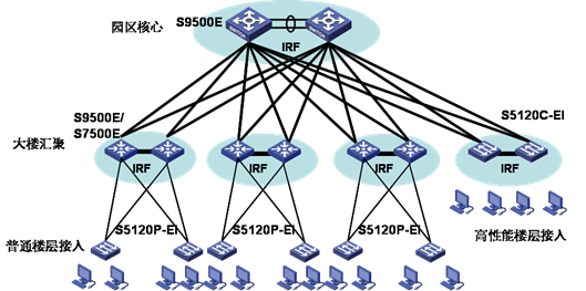 在大中型企業(yè)園區(qū)網(wǎng)中,S5120S-EI系列以太網(wǎng)交換機(jī)可作為接入交換機(jī),提供了高性能、大容量的交換服務(wù),并支持10GE的上行接口,為接入設(shè)備提供了更高的帶寬。此外整網(wǎng)核心層,匯聚層和高性能接入層均采用H3C創(chuàng)新的IRF(智能彈性架構(gòu))技術(shù),在原有網(wǎng)絡(luò)拓?fù)洳蛔兊那闆r下,通過將多臺(tái)設(shè)備虛擬為一臺(tái)統(tǒng)一的邏輯設(shè)備,實(shí)現(xiàn)網(wǎng)絡(luò)拓?fù)?、業(yè)務(wù)、管理的簡化,1:N的可靠性成倍提升,網(wǎng)絡(luò)運(yùn)行性能大幅提高等多重優(yōu)點(diǎn)。