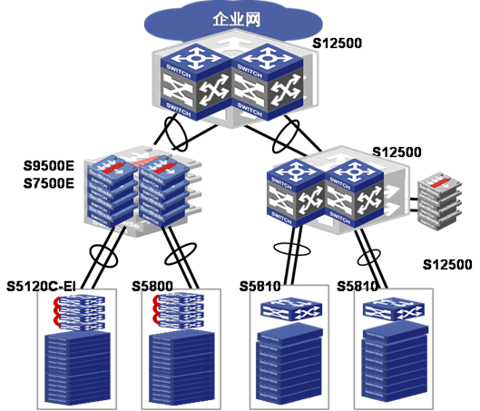 H3C采用基于100G平臺(tái)的S12500系列交換機(jī)作為數(shù)據(jù)中心核心,匯聚層可以采用S12500或S9500E/S7500E產(chǎn)品,通過集成的防火墻、負(fù)載均衡等多業(yè)務(wù)板卡來實(shí)現(xiàn)安全保證和流量均衡。接入層S5120C-EI系列可以提供高密度的千兆服務(wù)器接入方案。