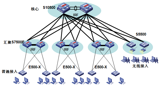 H3C E500-X系列交換機(jī)支持IRF2(第二代智能彈性架構(gòu))技術(shù),將多臺(tái)物理設(shè)備互相連接起來(lái),使其虛擬為一臺(tái)邏輯設(shè)備,也就是說,用戶可以將這多臺(tái)設(shè)備看成一臺(tái)單一設(shè)備進(jìn)行管理和使用。IRF可以為用戶帶來(lái)以下好處: