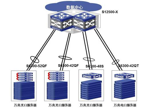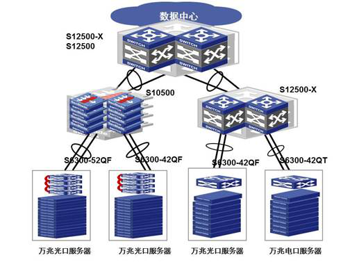 H3C采用基于100G平臺的S12500-X、S10500系列交換機(jī)作為數(shù)據(jù)中心核心,匯聚層可以采用S12500-X或S10500產(chǎn)品,接入層S6300系列可以提供高密度的萬兆服務(wù)器接入方案。
