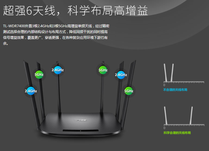 TL-WDR7400在高技術(shù)規(guī)格無線主芯片基礎(chǔ)上,采用外置獨立PA、LNA射頻芯片,在進(jìn)一步提高了無線發(fā)射性能的同時,降低無線信號接收噪音干擾,使無線信號收發(fā)性能更優(yōu)異。