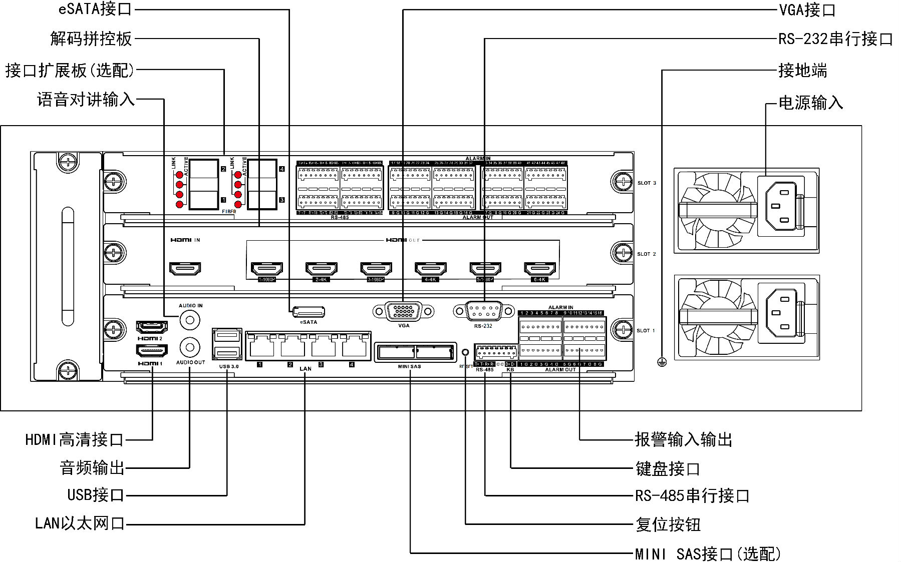 可選配接口擴(kuò)展板,支持4個(gè)千兆光口,8個(gè)RS-485串行接口,32進(jìn)16出報(bào)警接口。